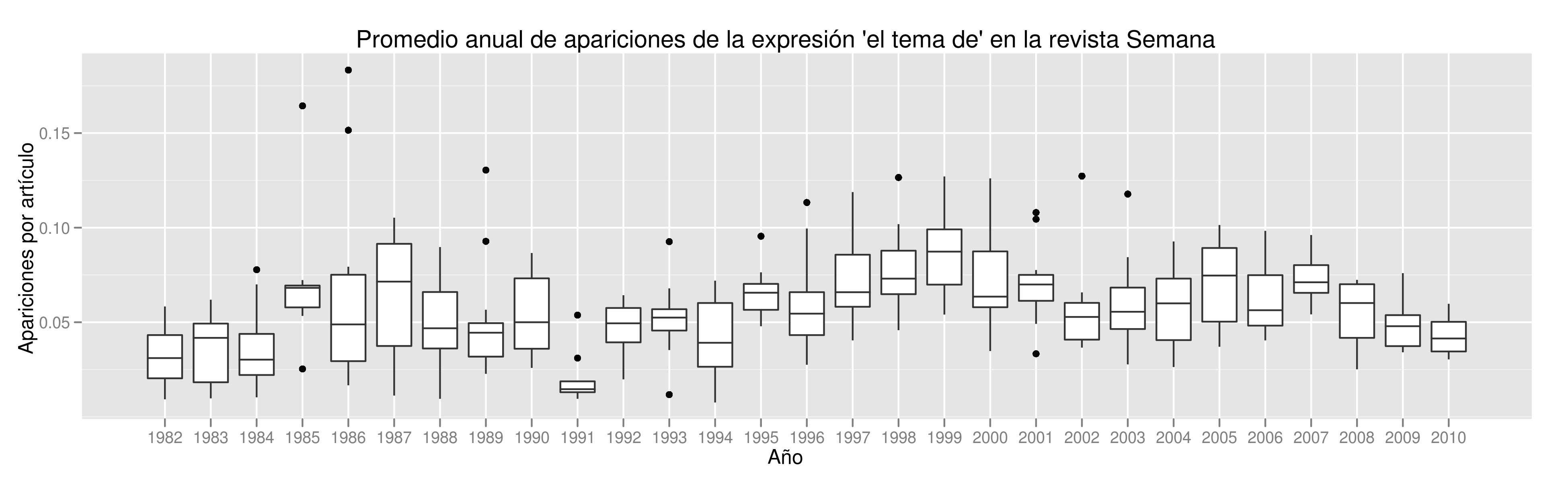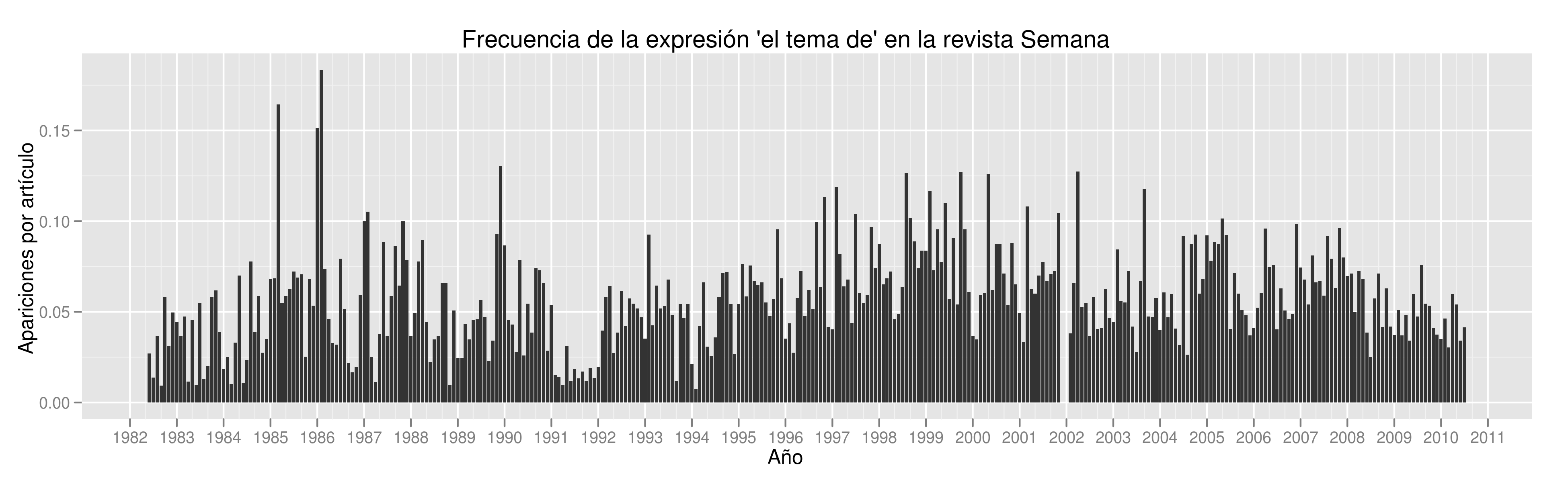 Para saber si la expresión se había vuelto más frecuente en los últimos años analicé el archivo de la revista Semana, que incluye las ediciones de la revista desde 1982 y los artículos que han publicado en su sitio web. Esta fue la colección de documentos digitalizados que me pareció más fácil de analizar y que se extiende durante un periodo de tiempo más largo. También creo que es adecuado utilizar estos artículos pues tienen diferentes estilos e incluyen varios formatos, como columnas, reportajes y entrevistas. La muestra que tomé tiene 95.998 artículos, publicados desde junio de 1982 hasta julio de 2010.