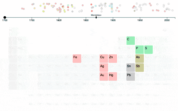 After a quick search I found a table with the list of the discoveries of the elements, and it seemed to be a good excuse to learn D3. I then started to work on a quick visualization project. The goal was to show how the table has changed since it was developed and to be able to find patterns in the discoveries. For example, I noticed that about half of the elements were already known when Mendeleev presented his table in 1869, and almost all the noble gases were observed for the first time in the 1890s.